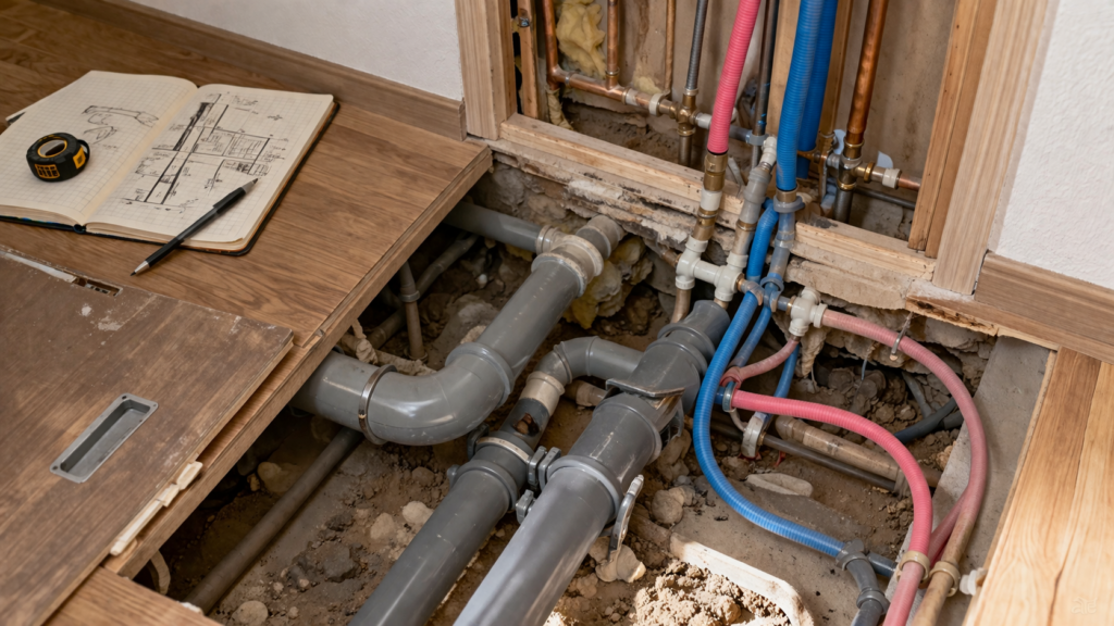 このテーマでは「配管を知る」ことに集中したいので、施工そのものの細かい話はここでは広げません。ただ、日本では給水装置工事に法的な枠組みがあるため、調査・記録の確認と、実際の工事判断は分けて考えるのが安全です。自分でやるべきなのは、資料を取り寄せて、現況を観察して、プランを整理するところまで。接続や通水、法的な手続きが絡む部分は、地域の指定業者や水道事業者に確認するのが基本です(水道法, n.d.; 厚生労働省, n.d.; DIY Renova, 2025b)。関連する内部リンクとして、DIYの限界線を整理したい方は 住宅リノベはどこまで自分でやると節約できるのか も相性が良いです。